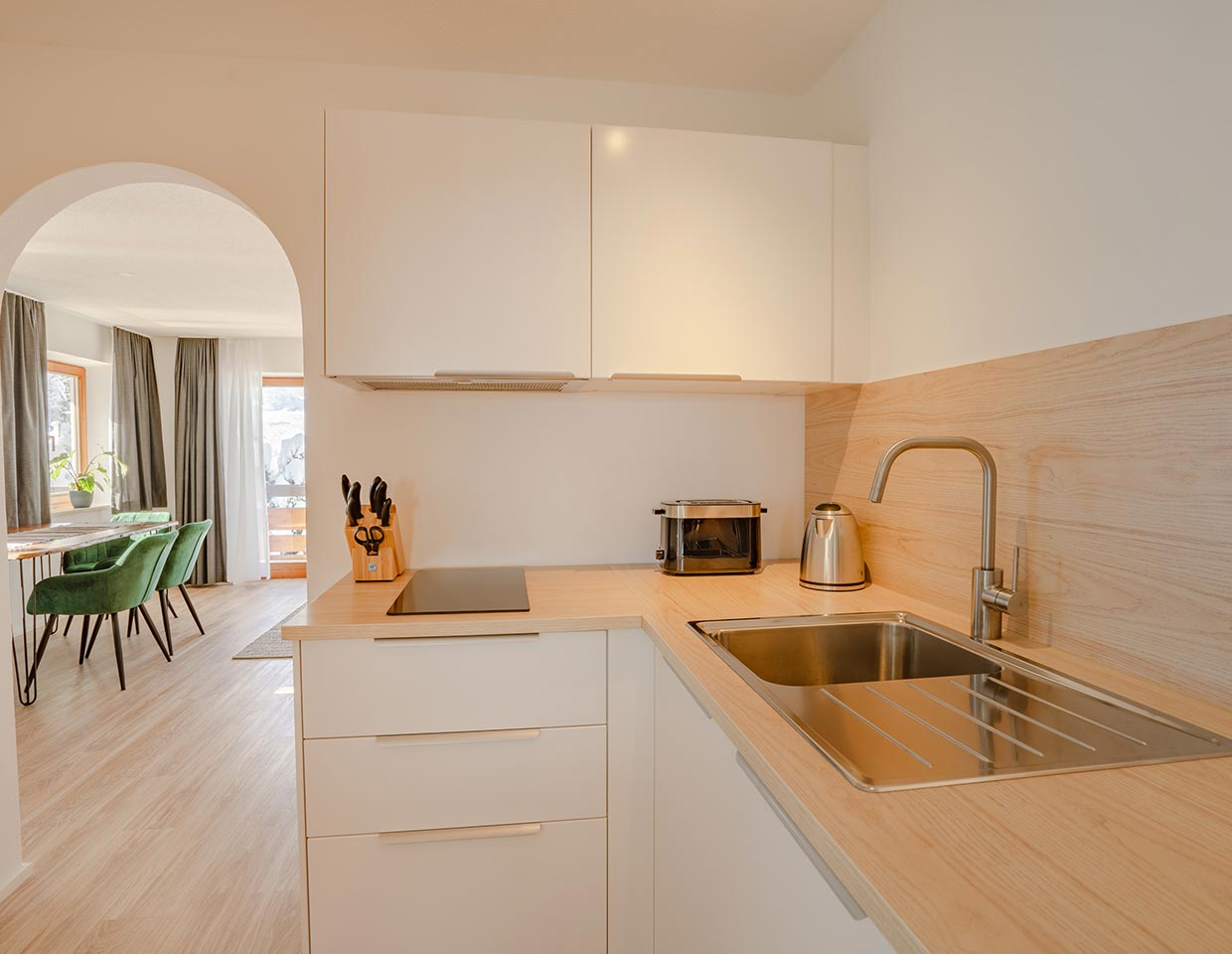 - Küche: Voll ausgestattete Küche mit Geschirrspüler, Kaffeemaschine, Herd und großzügiger Arbeitsfläche – hier macht das Kochen auch im Bergurlaub Spaß.