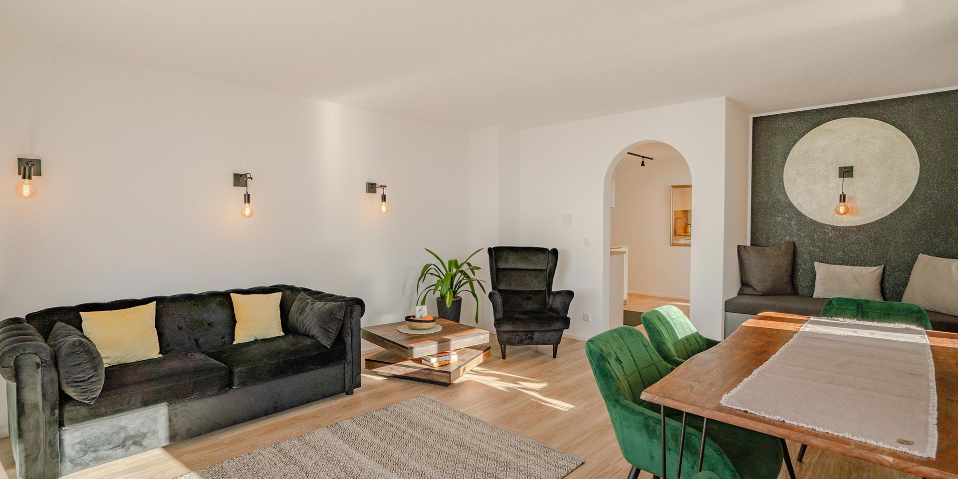 Großzügiger, heller Wohnbereich mit Esstisch für 4 Personen