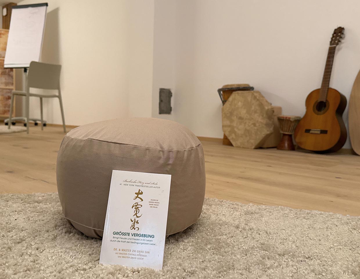 Ruhiger 50 m² Raum im Kleinwalsertal, am Fuße des Ifen. Matten, Kissen, Decken, Meditationsbänke vorhanden. Tageslicht, gute Belüftung, klare Ordnung. Handy aus, Schuhe aus, leise Ankunft 5 Minuten vor Beginn. Du brauchst bequeme Kleidung, eine verschließbare Flasche Wasser, bei Bedarf Socken und Pullover.